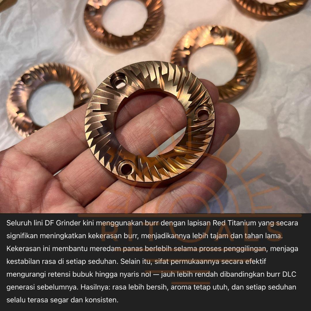Seluruh lini DF Grinder terbaru kini menggunakan burr dengan Red Titanium Coating. Lapisan ini memberikan daya tahan hingga 10 kali lebih awet dibanding stainless steel, serta retensi bubuk yang jauh lebih rendah dibanding DLC seperti pada seri sebelumnya. Distribusi partikel yang sangat stabil memastikan konsistensi hasil ekstraksi di setiap seduhan.