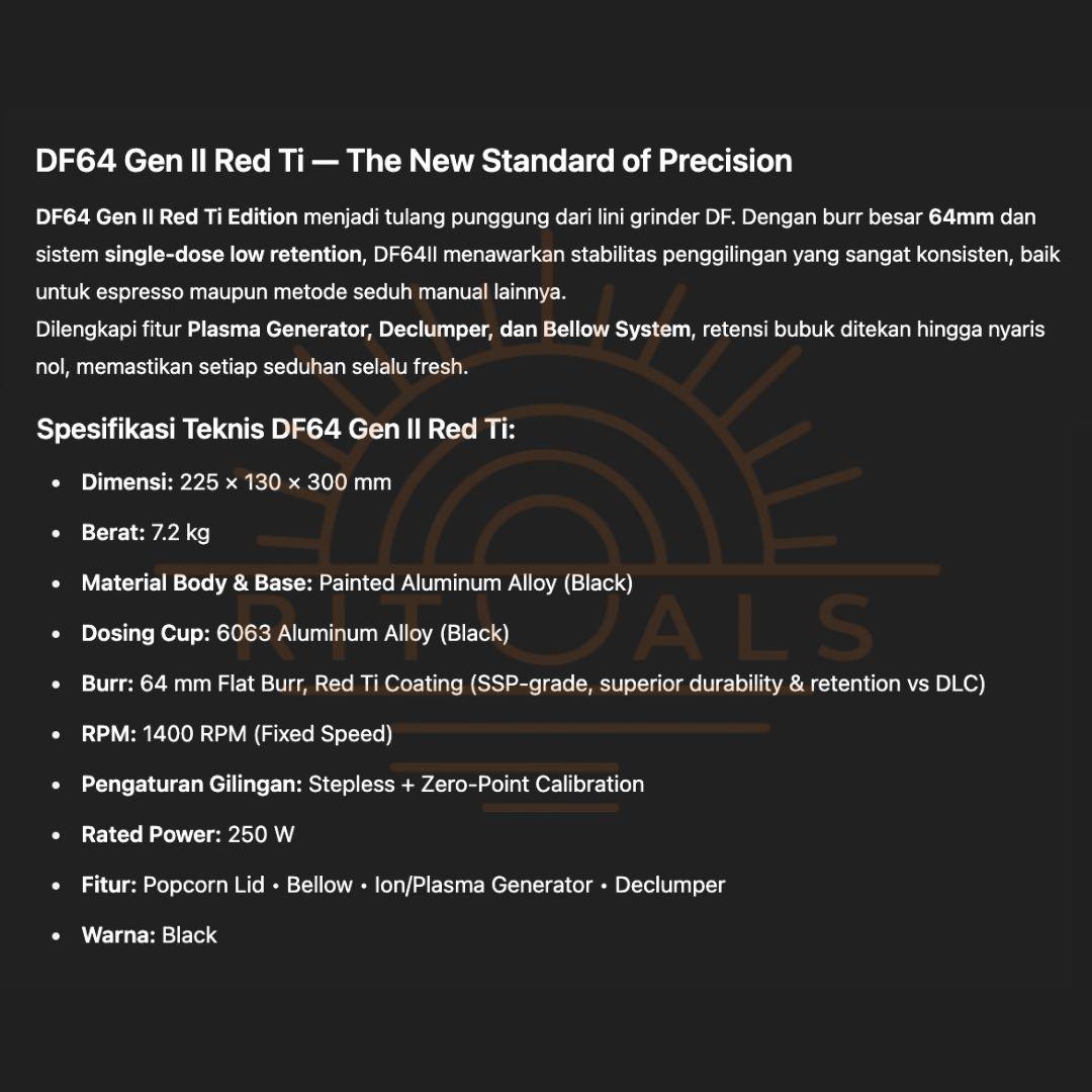 DF64 Gen II Red Ti Edition menjadi tulang punggung dari lini grinder DF. Dengan burr besar 64mm dan sistem single-dose low retention, DF64II menawarkan stabilitas penggilingan yang sangat konsisten, baik untuk espresso maupun metode seduh manual lainnya. Dengan tambahan fitur Plasma Generator, Declumper, dan Bellow System, retensi bubuk ditekan hingga nyaris nol, memastikan setiap seduhan selalu fresh.